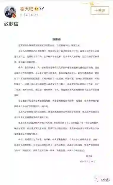 2月14日翟天临终于发声,在各大社交媒体平台发表了格式工整的致歉信,对近期网络上因其论文情况而引发的讨论,“懊悔不已、深度自责”。