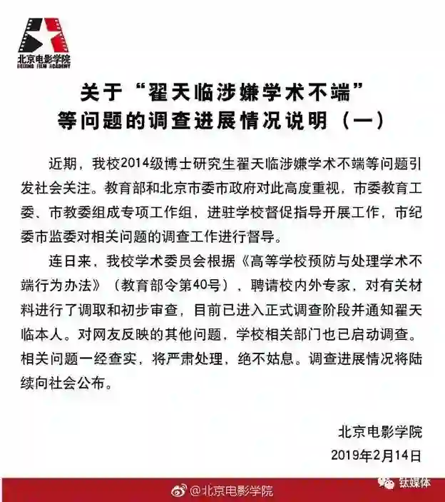 几乎是同时,北京电影学院官方也发布了第二封声明,对“翟天临涉嫌学术不端等问题的调查进展情况”进行了第一次说明,这封官方声明中表示,“目前已经进入正式调查阶段并通知了翟天临本人。对网友反应的其他问题,学校相关部门也启动调查。相关问题一经查实,将严肃处理,绝不姑息。”