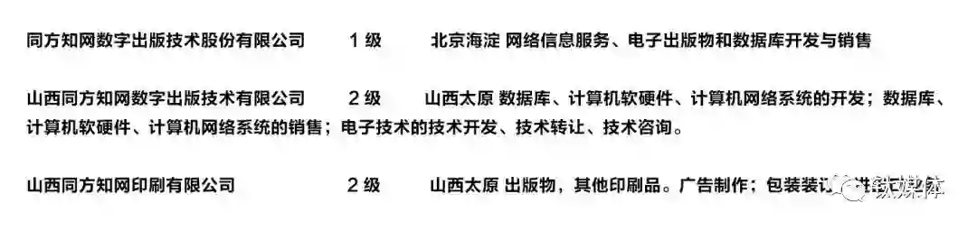 上述这5家公司均由同方股份100%持股。其中最主要的主体应该是同方知网数字出版技术股份有限公司,因为公告里说它是“重要一级控参子公司”。这家公司的主要业务是网络信息服务、电子出版物和数据库开发与销售。
