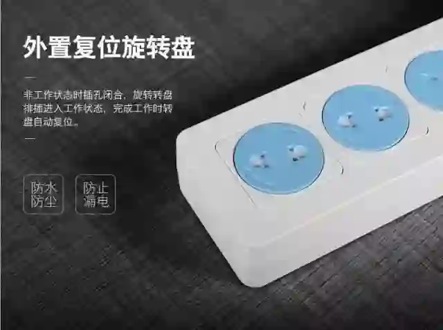 在插座的外部设置外置复位旋转盘,在非工作状态插孔闭合,既能防尘,防溅水,防油,还能防止孩子戳手指造成触电。