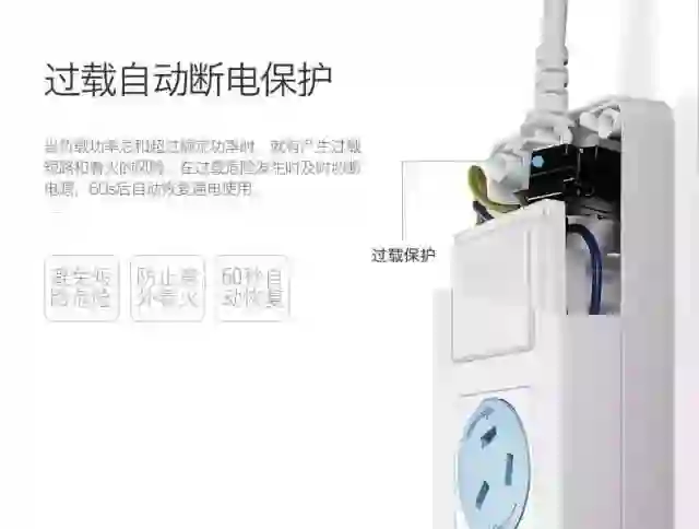 防溅水插座在安全性能方面也进行了提升,过载自动断电保护,当负载功率总和超过额定功率时,会及时切断电源,60s后自动恢复通电使用。