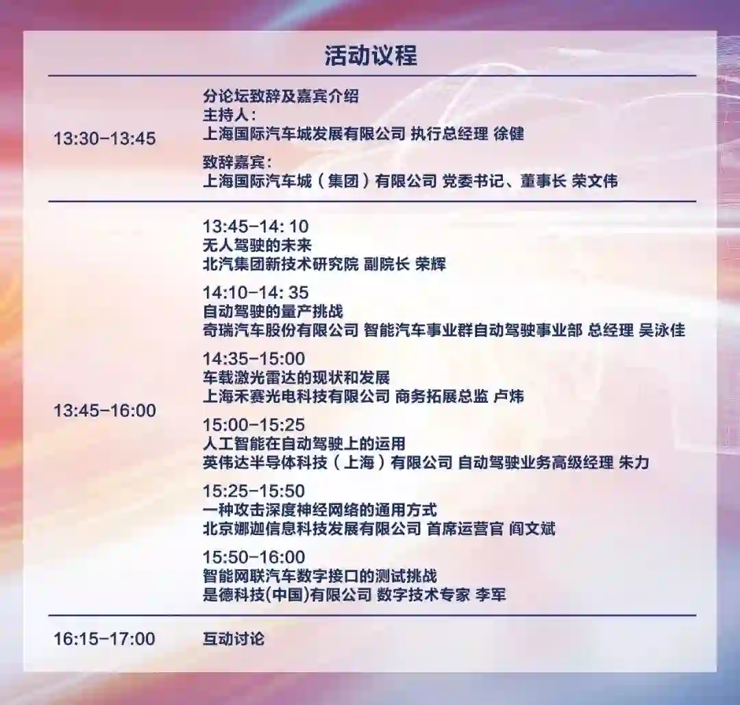 在本年度「未来汽车与交通变革」的主题号召下,上海国际汽车城坚持顺应行业趋势、整合行业资源、为汽车产业打造专业服务平台的愿景,将于大会首日(11 月 6 日)下午举办「人工智能推动车辆智能化技术变革」技术分论坛。分论坛将以人工智能为切入点,分享基于人工智能核心算法的车辆智能化系统、无人驾驶相关技术的应用部署、智能传感器及测试等前沿话题的主题演讲。并将邀请汽车产业链各方技术专家共同探讨人工智能和汽车智能网联化影响下的企业技术布局和战略思考。