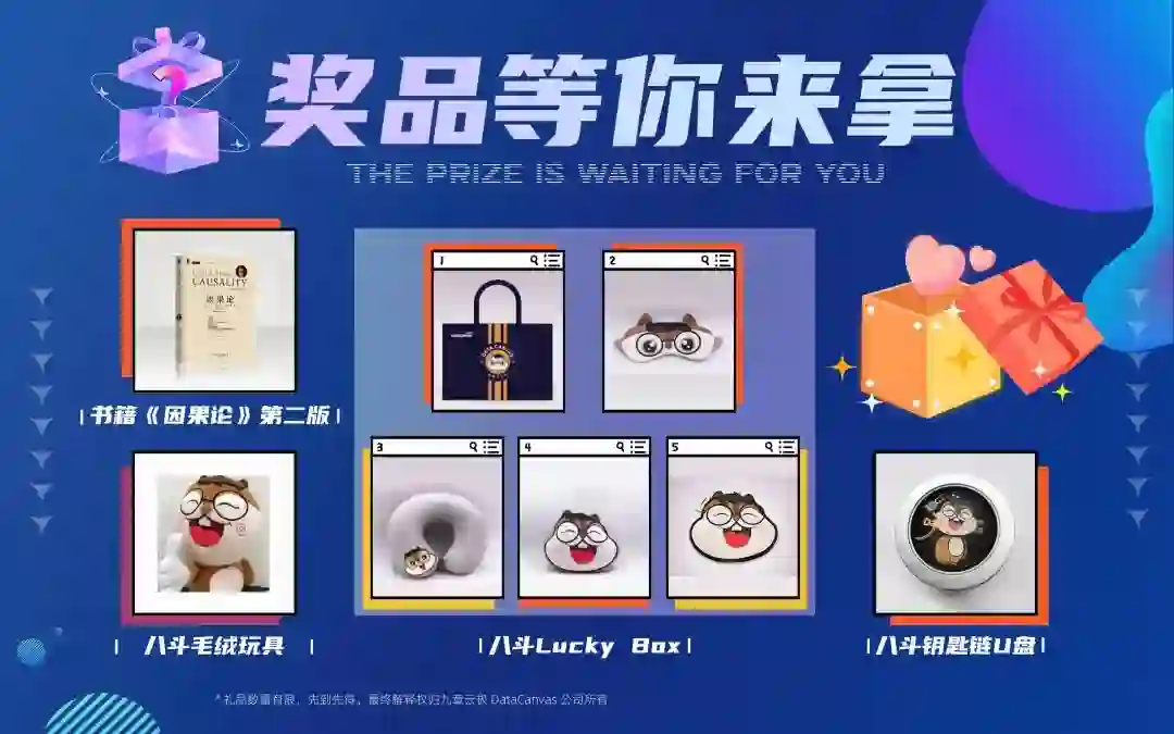 籍《因果论》第二版、八斗 Lucky Box、八斗毛绒玩具等在内的超多奖品。