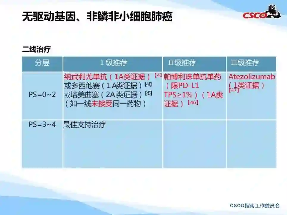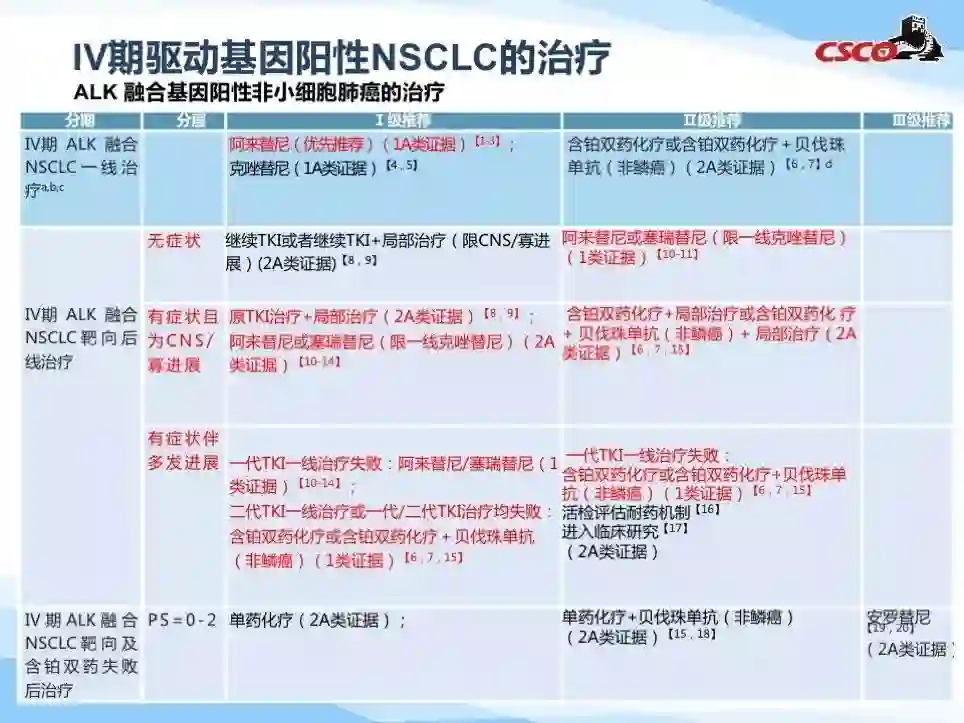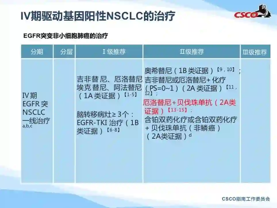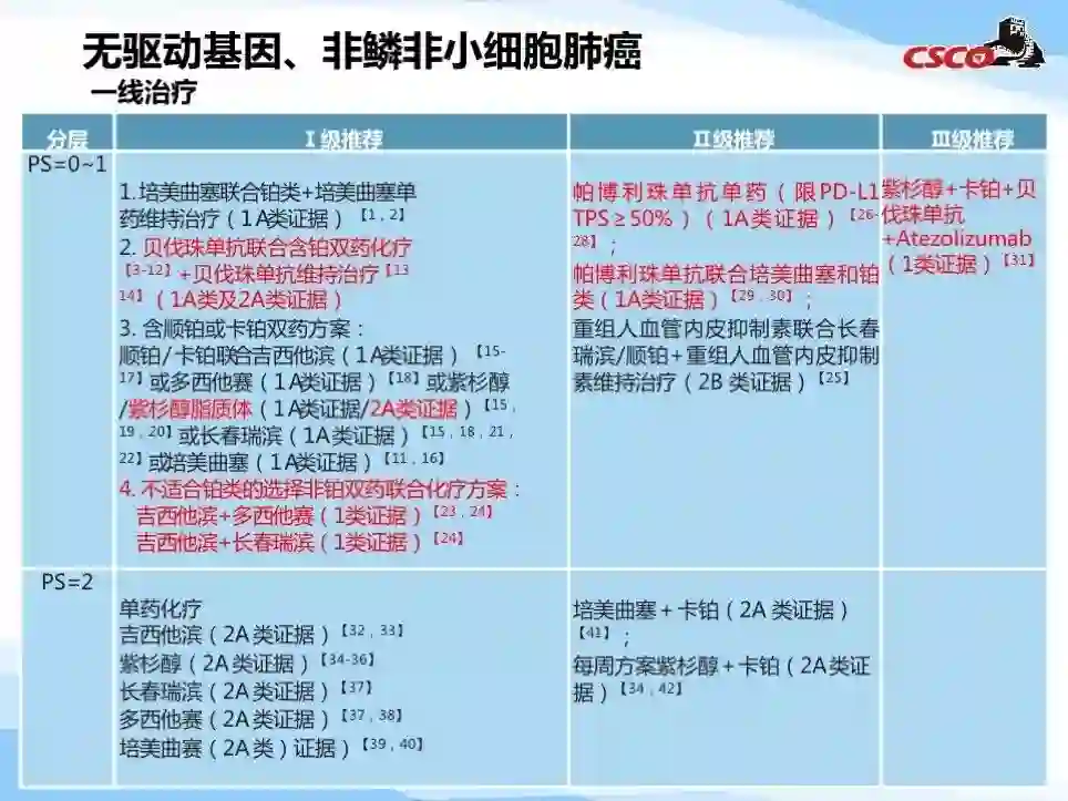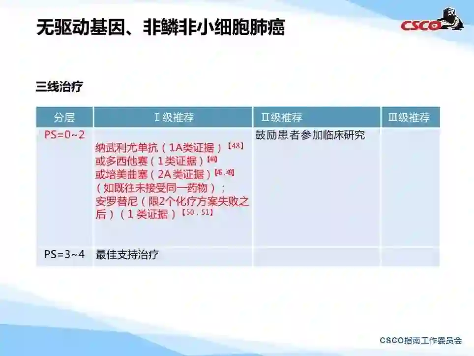第二个特点,CSCO指南兼顾到药物可及性。中国的国情和医保与美国不同,除了要考虑药物在国内是否上市,还要考虑上市新药是否进入医保,要考虑经济因素,所以指南在推荐级别上分为了Ⅰ级、Ⅱ级、Ⅲ级推荐。因为药物的可及性和价格,所以会发现有很多治疗方案的证据级别很高,但是却只是Ⅱ级或Ⅲ级推荐,这是CSCO指南与其他指南的区别,也是最大的特点。