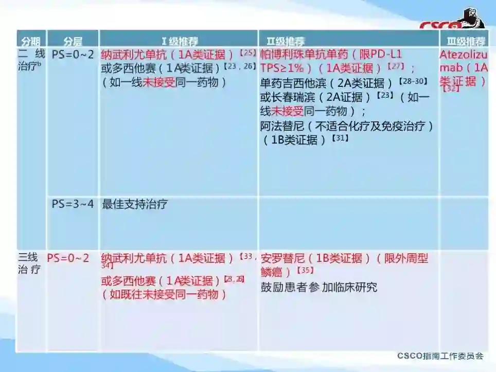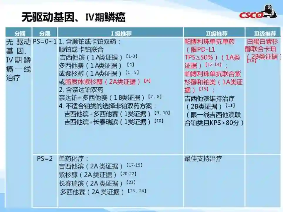周彩存教授:《CSCO原发性肺癌诊疗指南2019版》有四大亮点。首先,免疫治疗被第一次写入指南:纳武利尤单抗单药被推荐为无驱动基因、非小细胞肺癌(NSCLC)二线治疗方案(Ⅰ级推荐,1A类证据);帕博利珠单抗单药(限PD-L1 TPS≥50%,1A类证据)作为无驱动基因NSCLC一线治疗Ⅱ级推荐;帕博利珠单抗联合培美曲塞和铂类(1A类证据)作为无驱动基因、非鳞NSCLC一线治疗Ⅱ级推荐;帕博利珠单抗联合紫杉醇和铂类(1A类证据)作为无驱动基因、鳞癌一线治疗Ⅱ级推荐;紫杉醇+卡铂+贝伐珠单抗+atezolizumab(1类证据)作为无驱动基因、非鳞NSCLC一线治疗Ⅲ级推荐。在不可手术ⅢA、ⅢB期原发性NSCLC的治疗上,新增durvalumab作为放化疗后的巩固治疗(Ⅲ级推荐,1A类证据)。关于Ⅰ级、Ⅱ级、Ⅲ级推荐的划分,充分考虑了中国的国情、药物在国内的适应证及可及性。