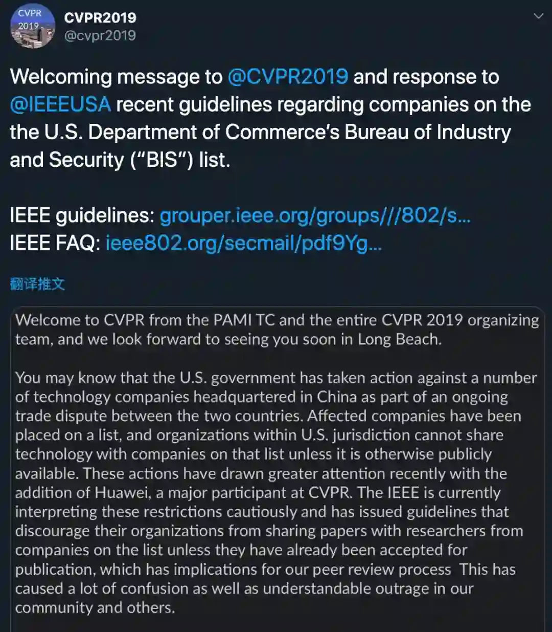 这样的盛会肯定会吸引很多国内学者参加,但最近华为遭遇美国政府「实体清单」的商业制裁,让人心生顾虑。毕竟 CVPR 的全称是 IEEE Conference on Computer Vision and Pattern Recognition——IEEE 国际计算机视觉与模式识别会议,是由计算机视觉基金会(Computer Vision Foundation,CVF)和 IEEE 计算机协会(IEEE Computer Society)举办的——而 IEEE 刚刚在 5 月 30 日表示:为保护其会员,必须遵守美国法规,限制华为等美国商务部「实体清单」中公司机构旗下的员工评审论文的权利。