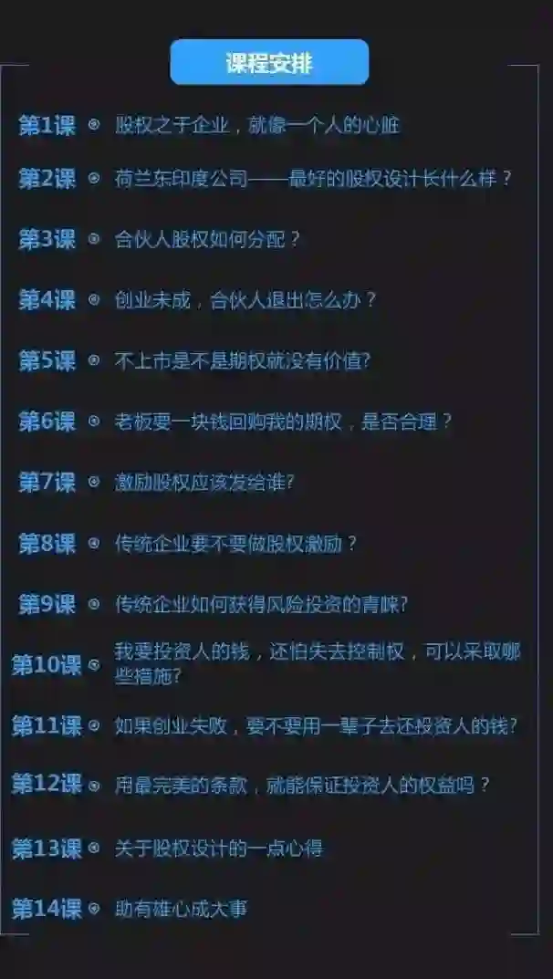 精心准备的课程(14期课程+数十期专项音频答疑):可以让那些经验不足的创业者,迷惑的员工,不理解创业投资模式的投资人、传统企业家,都能有机会学习国内最顶尖的股权思想和经验。
