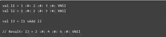 这将创建一个变量l1,它的类型签名不仅指定它Vector是包含的Ints,而且指定它的Vector长度为3.编译器可以使用此信息来捕获错误。让我们使用该vAdd方法在Vector两个之间执行成对加法Vectors: