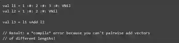 上面的例子工作正常,因为类型系统知道两者 Vectors都有长度3.但是,如果我们尝试了vAdd 两种Vectors不同的长度,我们没等到运行时就会在编译时得到一个错误。