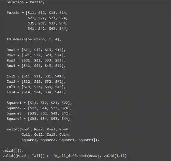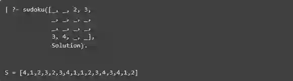声明性语言的美妙之处在于它允许你在更高层次的抽象中工作:你只需要描述所需输出的规范。例如,prolog中简单数独求解器的代码,只是列出了解决的数独谜题的每行,每列和对角线应该是什么样的: