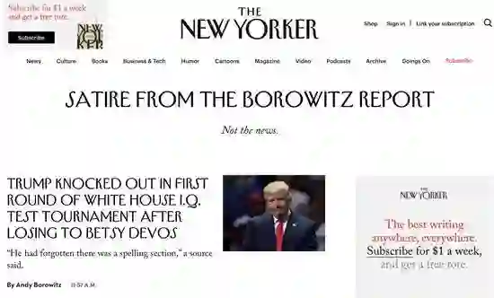 让国内媒体屡屡中招的假新闻,通常都来自几个美国知名媒体的恶搞专栏。最常见的大坑就是《纽约客》杂志的恶搞专栏《博洛维茨报告》(Borowitz Report)和洋葱新闻(The Onion)。他们在Facebook上的粉丝量高达90万和600万。