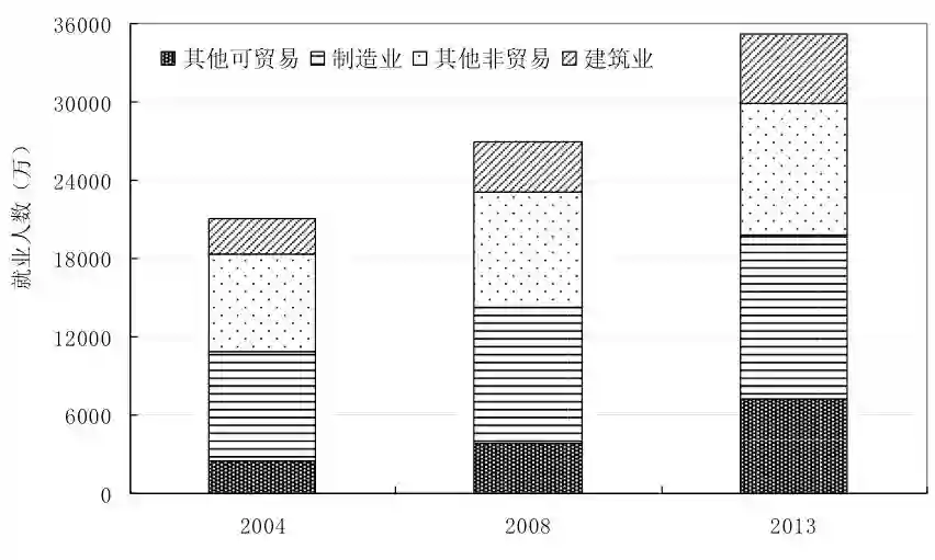 采用与斯彭斯等类似的分类方法,基于中国分别在2004年、2008年和2013年进行的三次经济普查数据,我们把非农产业中依据法人单位(corporate units)进行统计的就业,按照可贸易部门和非贸易部门进行分类,分别观察其增长规模和结构变化。这里,我们特别突出展示占比较大的可贸易部门中的制造业就业,以及非贸易部门中的建筑业就业(图2)。