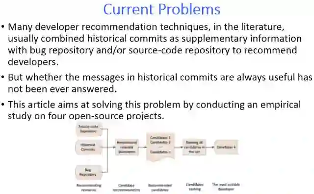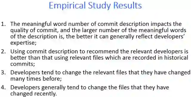 软件演化过程中,会出现各种各样的软件问题,这些软件问题需要及时有效地分配给合适的开发者解决。已有工作研究出各种各样的开发者推荐技术,其中很多技术挖掘历史提交信息,并与Bug库和/或源代码库等组合起来推荐开发人员。但是,历史提交中的信息是否总是有效的问题尚未得到解答。本文旨在通过对四个开源项目进行实证研究来验证挖掘历史提交信息支持开发者推荐的有效性。结果表明:1)长度较长的Commit提交描述可以较好地反映出开发者的历史开发经验,且Commit提交描述中关键词的数量越多,其质量越好;2)使用源码文件推荐开发者虽然可行,但使用Commit提交描述推荐开发者的质量会更好;3)大部分开发者倾向于修改以前多次修改过的文件,并且以前修改次数越多的文件,他们越偏向与修改这些文件,所以使用修改次数作为推荐开发者的排序参考因素是有效的;4)大部分开发者倾向于修改最近刚修改过的源码文件的偏好,所以使用最近修改时间因素排序推荐的开发者是有效的。