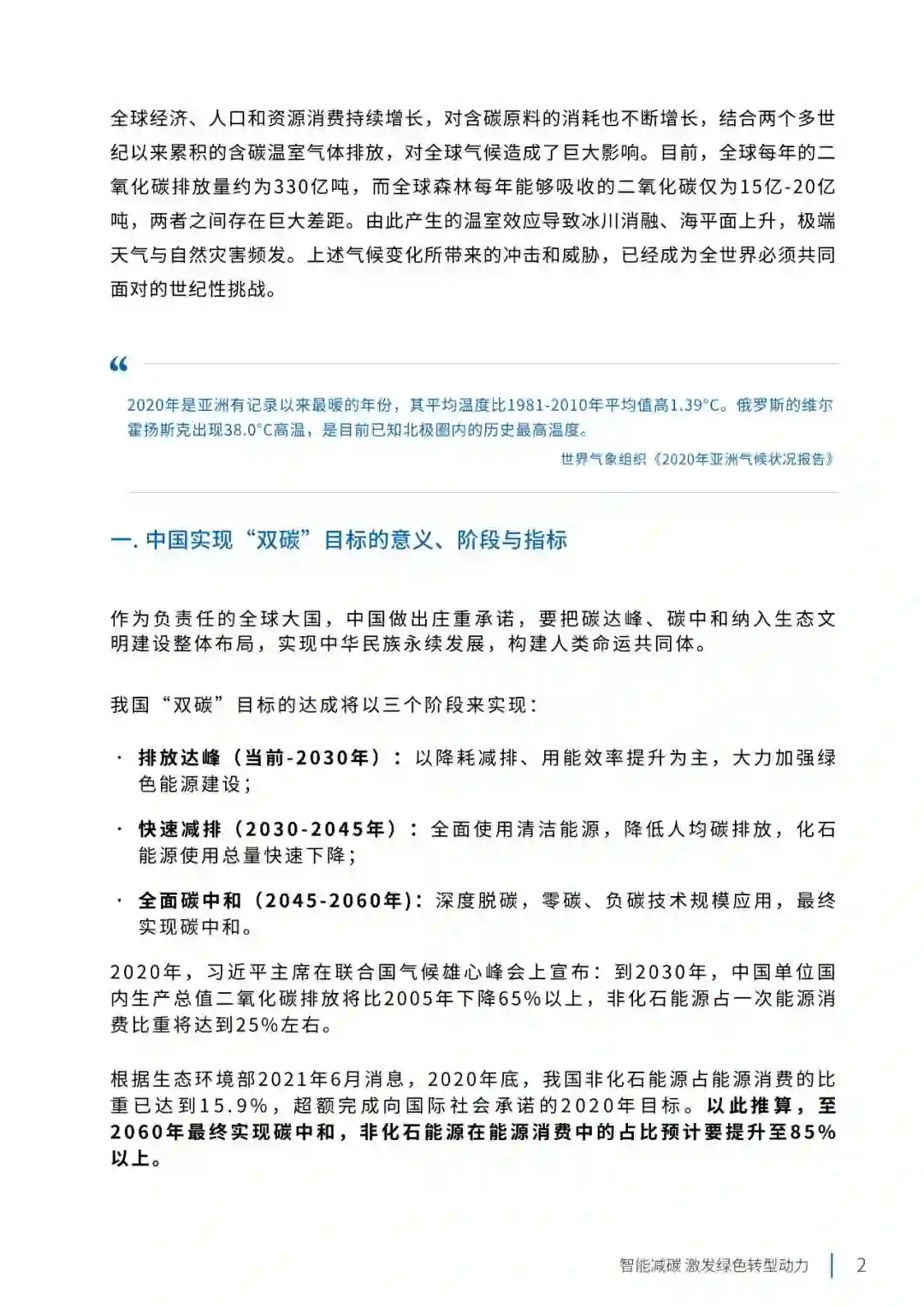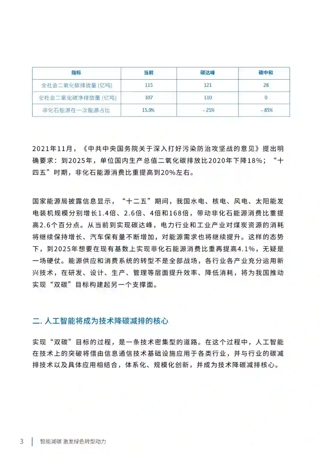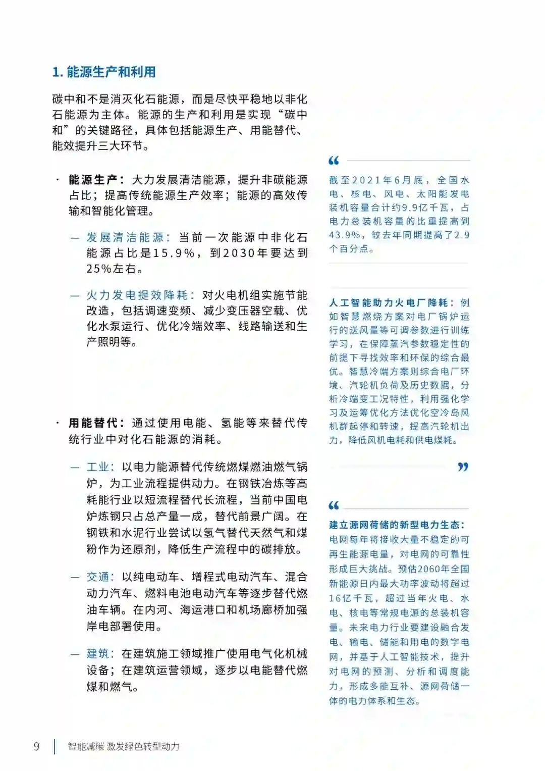 随着“力争在 2 0 3 0年前实现碳达峰, 2 0 6 0年前实现碳中和”成为国家重大战略决策,各界已积极行动起来,对如何实现上述宏观目标的方法、路径和阶段,展开了不同角度的有益讨论。当前,人工智能(AI)、云计算等技术正以惊人的速度成长,不仅向各个产业场景深度渗透,并使信息通信技术(ICT)的基础性和使能性特点得到进一步突显,构建起数字经济整体发展的智能化底座。这一创新变革将在实现“双碳”目标的实践中发挥怎样的作用、能做出怎样的贡献,是本白皮书主要讨论的议题。同时希望形成以下三点影响:1. 基础认知:增强读者对于中国达成“双碳”目标整体概况的认识;2. 启发探讨:梳理人工智能及信息通信技术应用于行业降碳减排的作用,以及未来着力方向;3. 呼吁行动:达成共识并促进业界各方实施行动。