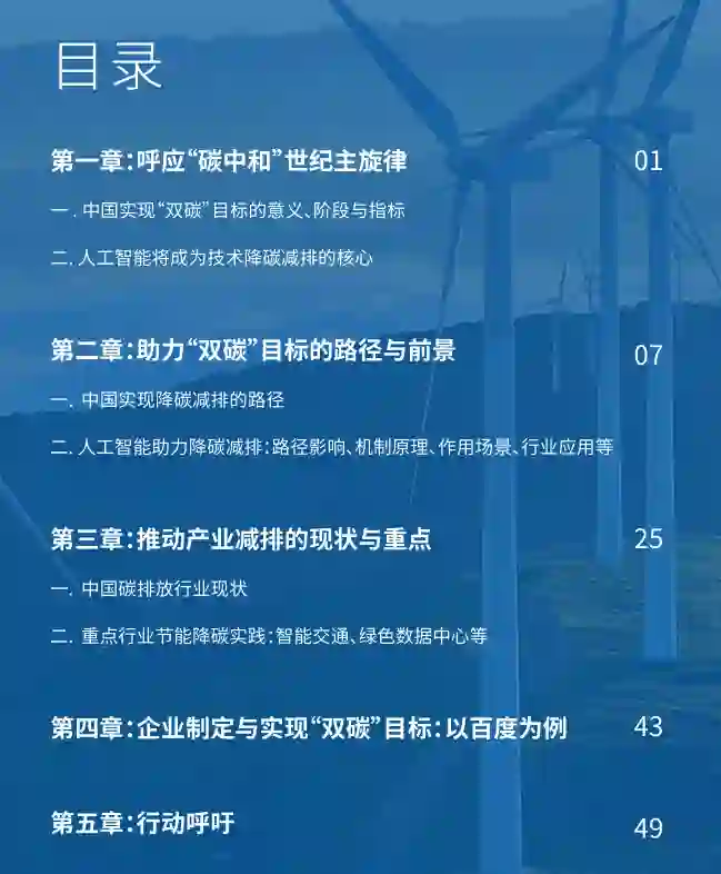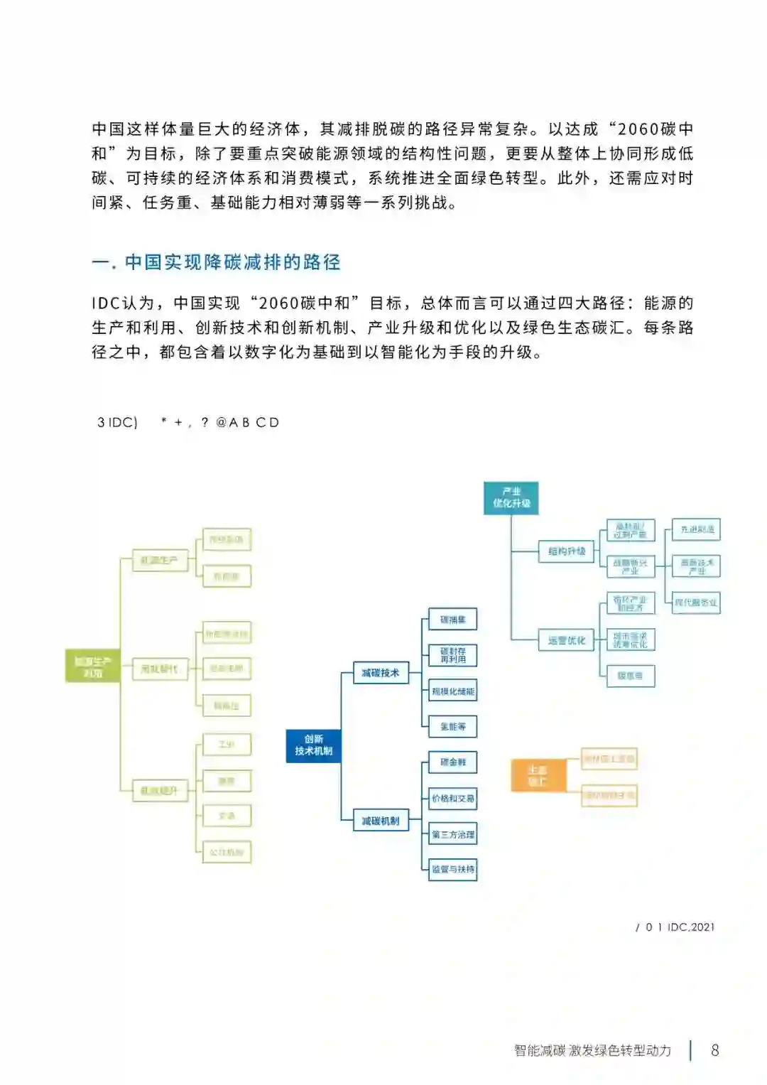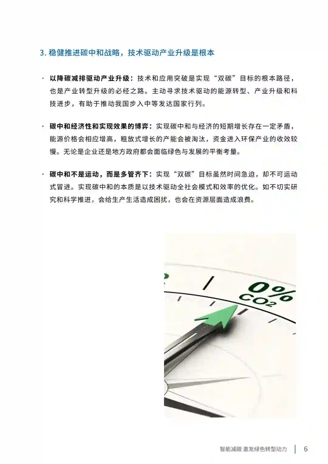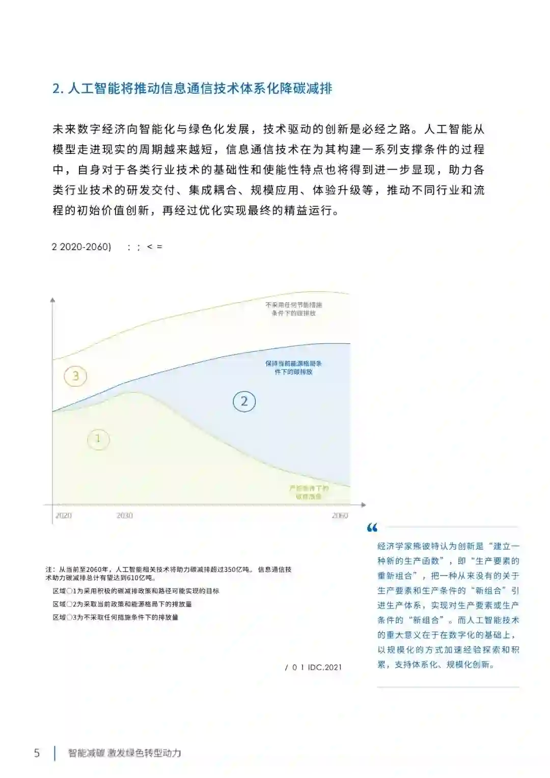 随着“力争在 2 0 3 0年前实现碳达峰, 2 0 6 0年前实现碳中和”成为国家重大战略决策,各界已积极行动起来,对如何实现上述宏观目标的方法、路径和阶段,展开了不同角度的有益讨论。当前,人工智能(AI)、云计算等技术正以惊人的速度成长,不仅向各个产业场景深度渗透,并使信息通信技术(ICT)的基础性和使能性特点得到进一步突显,构建起数字经济整体发展的智能化底座。这一创新变革将在实现“双碳”目标的实践中发挥怎样的作用、能做出怎样的贡献,是本白皮书主要讨论的议题。同时希望形成以下三点影响:1. 基础认知:增强读者对于中国达成“双碳”目标整体概况的认识;2. 启发探讨:梳理人工智能及信息通信技术应用于行业降碳减排的作用,以及未来着力方向;3. 呼吁行动:达成共识并促进业界各方实施行动。
