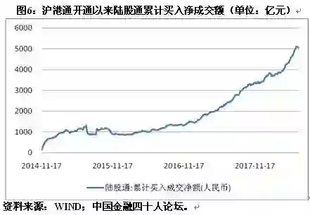 其次,中国经济稳中向好的发展韧性有待检验。4、5月份,中国投资和消费增长放缓引发了市场看空情绪。然而,在新旧动能转换、经济震荡筑底过程中,经济指标时好时坏在所难免。对于做趋势的长期投资者来讲,仍是进入的机会。2018年前5个月,境外机构新增国债和政策性银行债持有2369亿元,去年同期为减少23亿元;上半年(截至6月28日),陆股通累计买入净成交额新增1602亿元,同比增长66%,甚至6月份国内汇市股市震荡期间,还累计净流入了285亿元(图5和图6)。