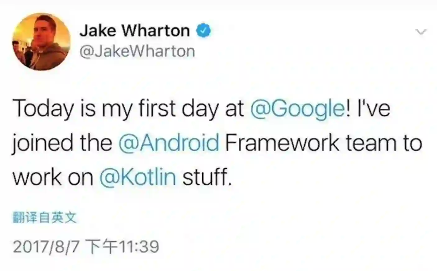 前几天 Jake Wharton 发布推文称已入职 Google,并加入了 Android 框架团队,从事于kotlin 方面的工作。