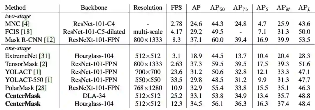 图5. CenterMask与其他方法在COCO test-dev数据集上的对比