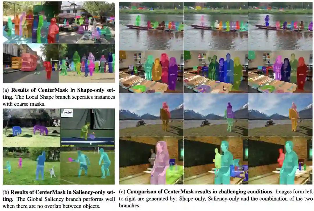 为了验证本文提出的Local Shape和Global Saliency两个分支的效果,我们对独立的分支进行了分割结果的可视化,如图4所示。其中(a)表示只有Local Shape分支网络的输出结果,可以看到,虽然预测的mask比较粗糙,但是该分支可以较好的区分出不同的物体。(b)表示只有Global Saliency分支网络输出的结果,可以看到,在物体之间不存在遮挡的情形下,仅用Saliency分支便可实现物体精细的分割。(c)表示在复杂场景下CenterMask的表现,从左到右分别为只有Local Shape分支,只有Global Saliency分支和二者同时存在时CenterMask的分割效果。可以看到,在物体之间存在遮挡时,仅靠Saliency分支无法较好的分割,而Shape和Saliency分支的结合可以同时在精细分割的同时实现不同实例之间的区分。