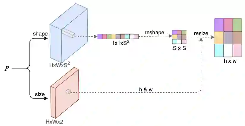 为了区分位于不同位置的实例,我们采用每个实例的中心点来对其mask进行建模,中心点的定义是该物体的bounding box的中心。一种直观的想法是直接采用物体中心点处提取的图像特征来进行表示,但是固定大小的图像特征难以表示不同大小的物体。因此,我们将物体mask的表示拆分为两部分:mask的形状和mask的大小,用固定大小的图像特征表示mask的形状,用二维向量表示mask的大小(高和宽)。以上两个信息都同时可以由物体中心点的表示得到。如图3所示,P表示由backbone网络提取的图像特征,shape和size表示预测以上两个信息的分支。用Fshape(大小为H*W*S*S