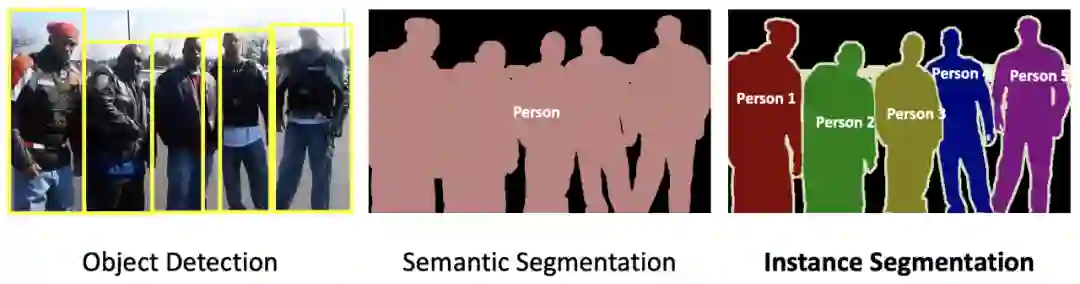 图1. 目标检测,语义分割和实例分割的区别[1]