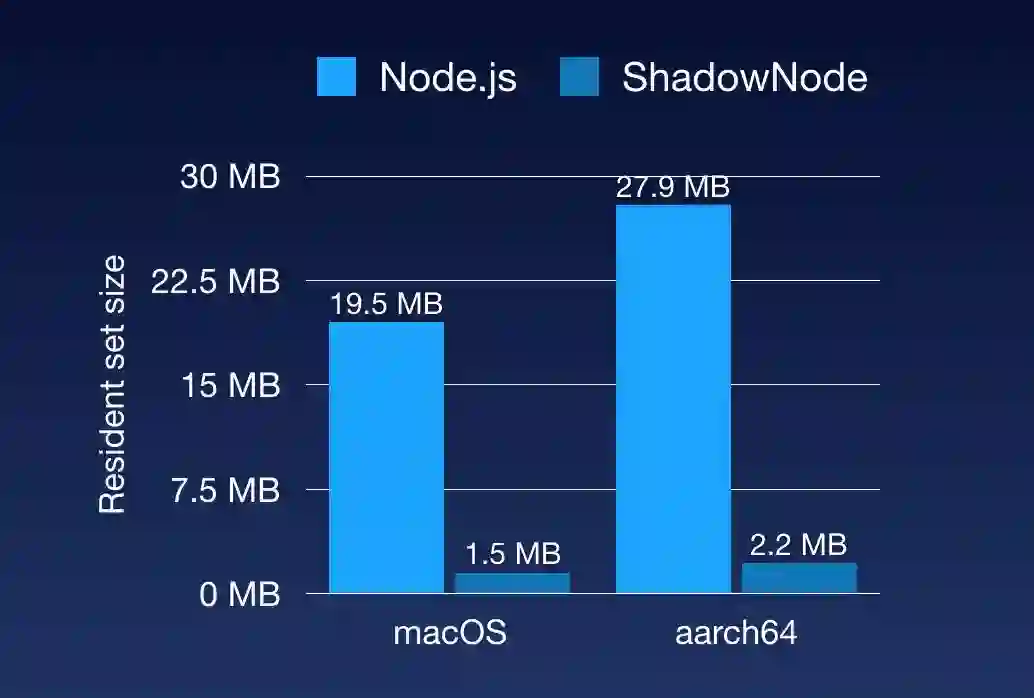 简单来说呢,ShadowNode 就是为了能让 JavaScript 能愉快地跑在 IoT 设备上而存在的,下面是 ShadowNode 与 Node.js 的一些资源占用上的对比: