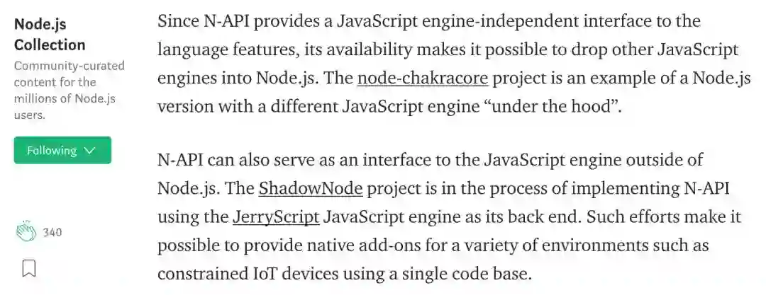 N-API 作为 Node.js Add-on 的 ABI 兼容的接口,可以让任何程序在不需要重新编译的情况下无缝运行在 node-chakracore 与 node-v8 上,ShadowNode 同样如此,我们按照 N-API 的标准文档和测试集,实现了在 ShadowNode 上的 N-API,这样在不需要重新编译的情况下,也能在 Node.js 和 ShadowNode 跨运行时运行,这使得我们可以根据不同的设备配置,选择合适的运行时,而上层的代码则不需要任何修改。