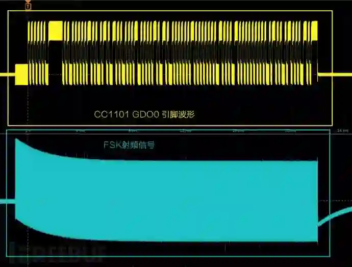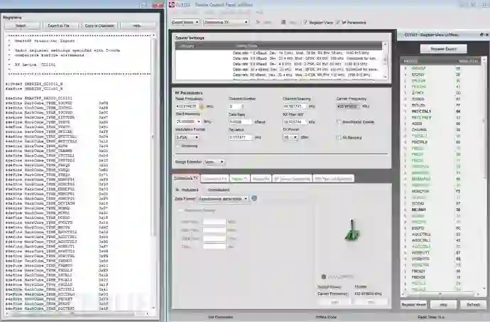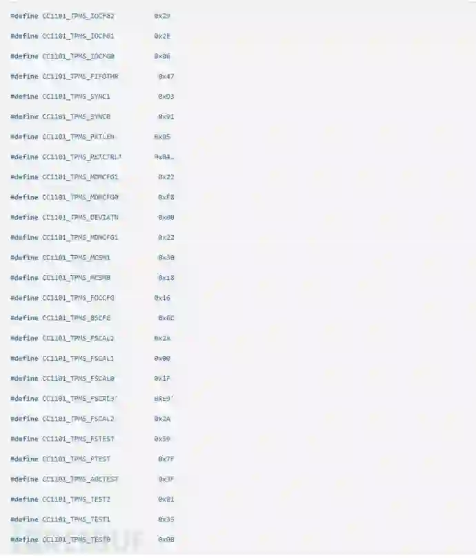 这个是根据胎压传感器信号生成的CC1101寄存器的配置,可以通过SmartRF Studio配置完参数后导出,不过有些寄存器是不支持IDE去进行设置的,必须是根据芯片的datasheet去修改的,比如说让射频芯片处于异步模式,切换射频芯片的工作状态等等。