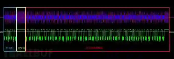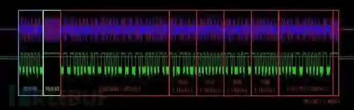 这个就是整一段胎压传感器发射出来的信号了,前面是前导码用于唤醒接收端使用的,前导码后面一个特别长的脉冲信号是同步引导码用于发射端和接收端同步时钟使用的,后面就是胎压的有效数据了,我们可以对这个有效数据进行分析了。