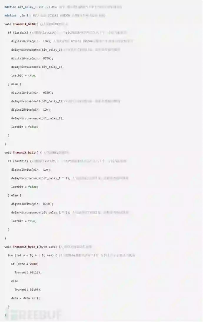 然后这个是发射数据操作函数,算出CRC数据后根据Transmit_data的数据内容在GDO0这个引脚上输出对应的波形。
