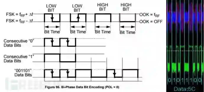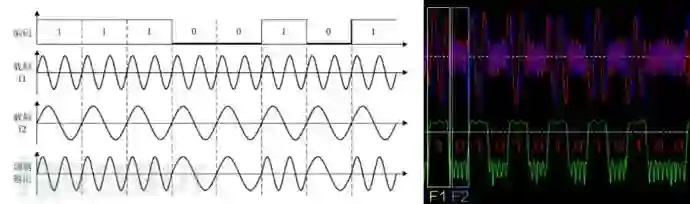 2FSK调制方式简单来说就是两种频率来表示 Bit 0,Bit 1,如图所示假如我们要发射11100101,这段数据在要发送Bit 1数据时候频率切换成了载波频率F1,要发送Bit 0数据时候切换到载波频率F2,最后的调制输出就是我们用软件无线电接收到的结果了,然后我们可以通过这种方式将信号数据解调下来了进行分析了。