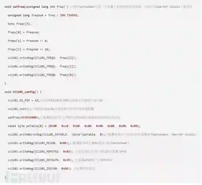 在cc1101.init()函数中将刚刚的射频配置写入CC1101的相关寄存器中,然后我们挑几个关键的讲讲,setfreq函数用于将CC1101设置在胎压的工作频率上,MDMCFG2设置芯片的调制模式为2FSK,我们这里使用的芯片的异步模式,就是通过引脚去将数据发射出来,不是通过SPI方式将要发射的数据写入到芯片的发射缓存区中。