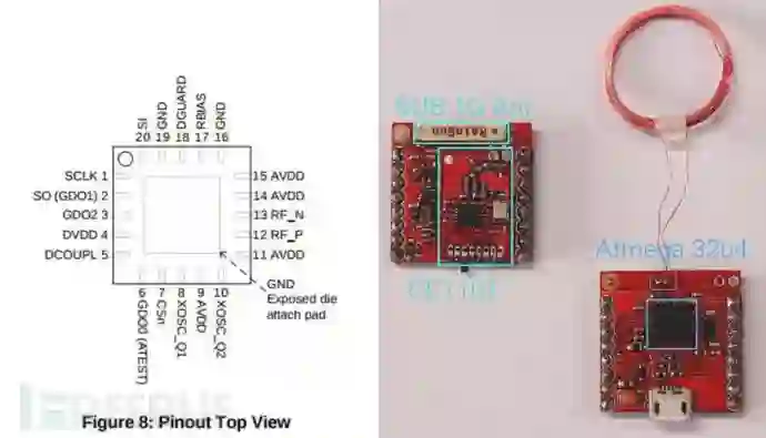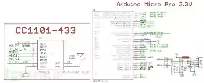 之后我们就可以根据这个去发射伪造传感器的数据了,这里我使用的TI的CC1101 射频芯片,我们通过Atmega32u4通过SPI(MOSI,MISO,SCK,CS)配置射频芯片CC1101的相关射频寄存器,然后通过CC1101的GDO0引脚将射频数据发出,也可以采用数据包模式将数据发射出来,但是因为数据包模式不方便兼容其他的类型的胎压设备。
