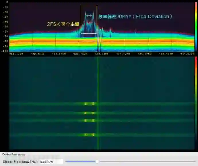 然后我们可以通过观察频谱(Fosphor)方式得到该信号工作在433.92Mhz上,调制方式为2-FSK,两个主瓣之间的频率偏差20.5Khz(Deviation),然后我们通过软件无线电的方式将胎压的原始信号接收下来进行分析。