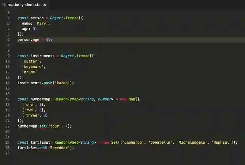 我们用了 const ,所以这个变量不能被重新赋值,但是还有一个问题:这个对象可以被改变。下面的代码展示了,为了真正使其不可变,你不仅需要防止它被重新赋值,你也需要不可变的数据结构。JavaScript 语言提供了 Object.freeze 方法来阻止对象被改变。