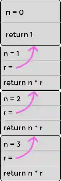 这里发生了什么?我们得到一个堆栈溢出错误!这不是无穷的递归导致的。我们已经处理了基础条件(n === 0 的情况)。那是因为浏览器的堆栈大小是有限的,而我们的代码使用了越过了这个大小的堆栈。每次对 recursiveFactorial 的调用导致了新的帧被压入堆栈中,就像一个盒子压在另一个盒子上。每当 recursiveFactorial 被调用,一个新的盒子被放在最上面。下图展示了在计算 recursiveFactorial(3) 时堆栈的样子。注意在真实的堆栈中,堆栈顶部的帧将存储在执行完成后应该返回的内存地址,但是我选择用变量 r 来表示返回值,因为 JavaScript 开发者一般不需要考虑内存地址。