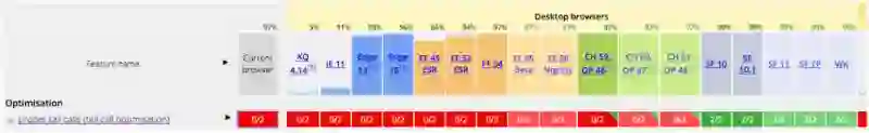 现在选一个浏览器运行吧,假设你在使用 Safari,你会得到 Infinity(它是比在 JavaScript 中能表达的最大值更大的数)。但是我们没有得到堆栈溢出错误,那很不错!现在在其他的浏览器中呢怎么样呢?Safari 可能现在乃至将来是实现 PTC 的唯一一个浏览器。看看下面的兼容性表格: