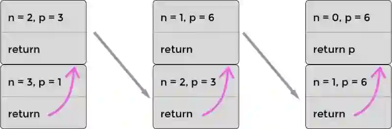 递归计算 3! 的堆栈(三次乘法)使用 PTC