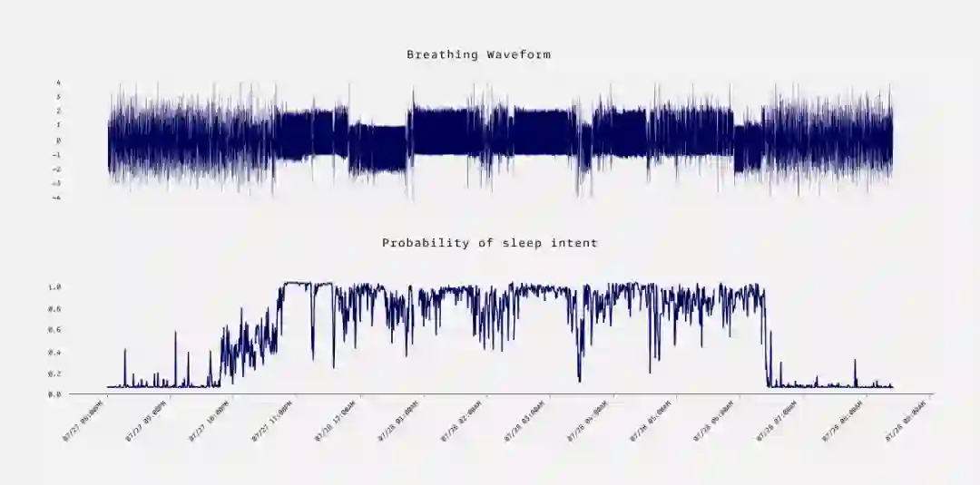 Halo Rise 的核心技术是内置雷达传感器,其可以安全地发射接收超低功率无线电信号。该传感器使用不同天线处反射信号之间的相位差来测量运动和距离。通过片上信号处理,Halo Rise 产生与用户呼吸对应的离散波形。同时,该设备无法检测与单个用户相关的噪声或视觉标识符,例如身体的图像。