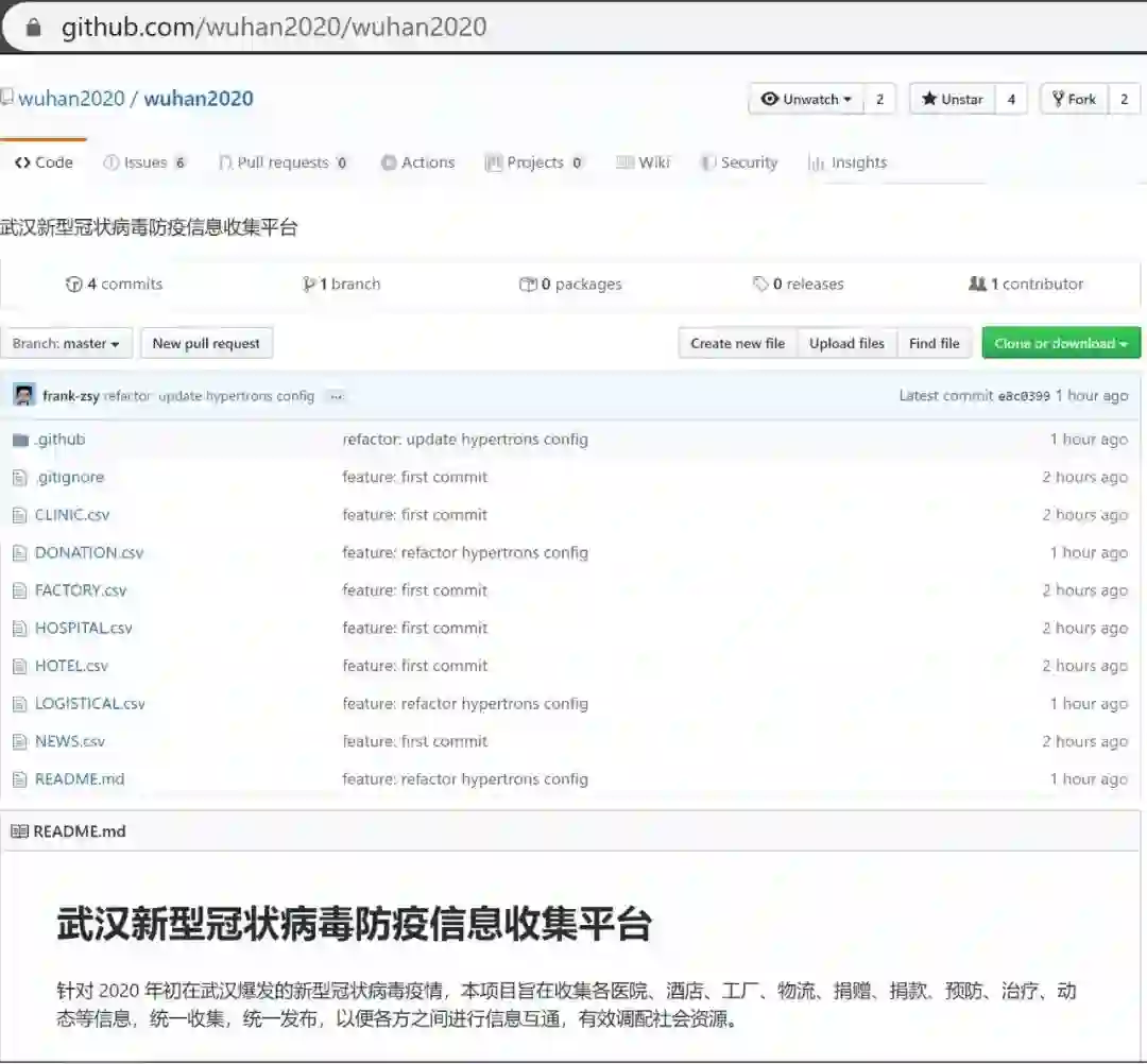 我们发起wuhan2020开源项目,收集经过审核与确认过的武汉新型冠状病毒防疫相关信息,望众程序员与开发者可以齐心协力,加入我们,共克时艰,项目地址:
