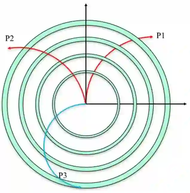 ►图6: 在轴对称探测器中,带电粒子受到磁场作用发生偏转的情形