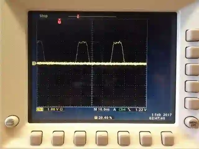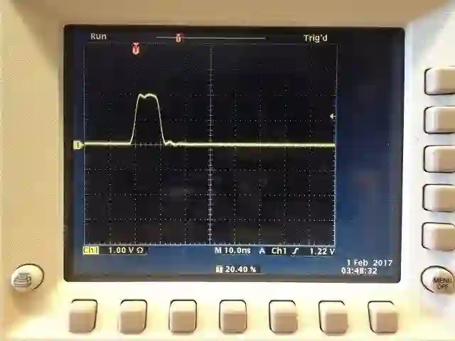 不过,当输入信号是比较窄的脉冲时,情况就不同了。比如对于宽度10纳秒,重复频率1 兆赫兹的脉冲,占空比为1%,也就是说只有1%的时间里存在信号。如果我们将示波器的时间轴调到如图2 所示,满度80纳秒,则平均十次扫描有八九次看不到任何波形。即使碰巧抓到了,波形也会随意出现在屏幕上的任何位置。