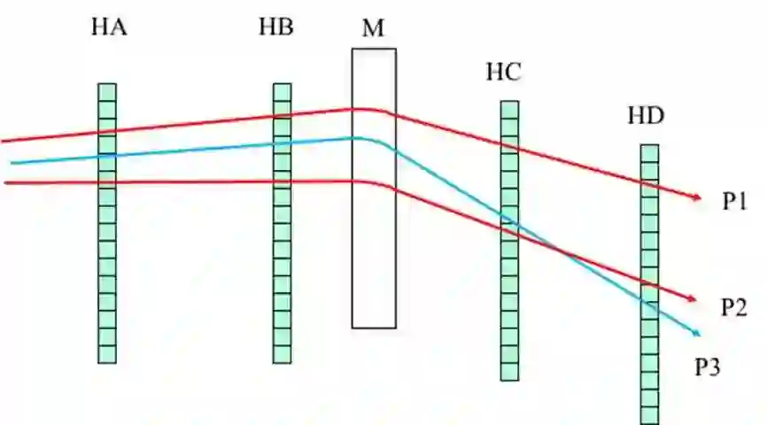 衰变产物在飞行过程中,打在四层探测器HA、HB、HC、HD上。 而这四层探测器,每一层都是由若干个探测器单元构成的,比如对于HA这一层,从上到下分别是HA(0),HA(1),HA(2)等。显而易见,如果我们希望确认一个高动量的带电粒子轨迹,例如P1,只要找到类似如下的逻辑关系式就可以了。