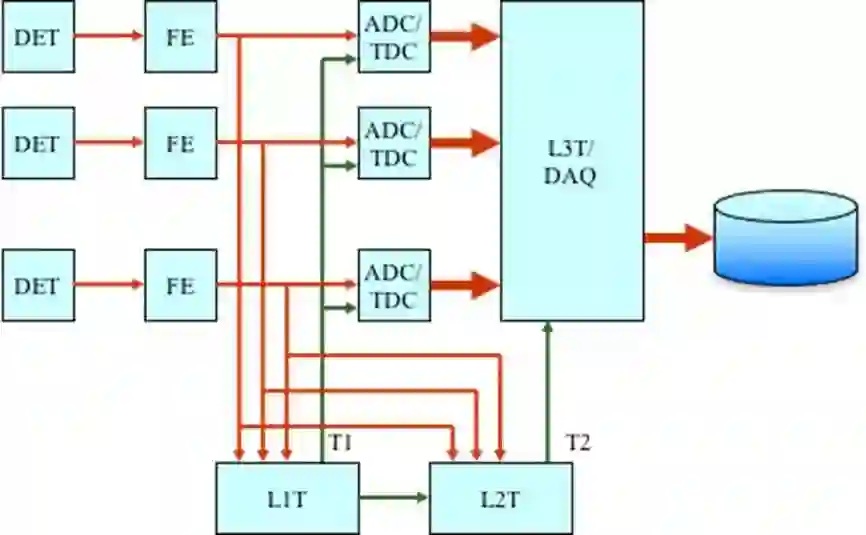 探测器(DET)所生成的电信号经过前级电子电路(FE)首先送到第一级触发系统(L1T)中,利用快速逻辑电子电路做粗略的判断。第一级触发系统判断可能存在有用的物理事件后,发出一个触发信号(T1),启动数字化(ADC/TDC)系统。早期的数字化器件,一旦被启动便无法继续监测输入信号。因此如果数字化进程启动得过于频繁,就会带来很大比例的系统死时间。因而,必须首先判断出在探测器里存在比较靠谱的信号组合时才能启动数字化,“不见兔子不撒鹰”。
