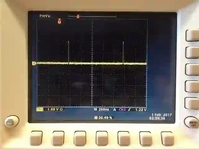 读者可能会觉得,如果我们把示波器的时间轴调成满度1微秒以上,不就能至少抓住一个脉冲吗?道理上确实没错,不过这时波形如图3 所示,在图中,满度宽度为1.6微秒,脉冲相对而言非常窄,看不清楚细节。