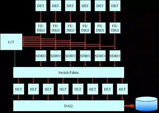 需要注意的是,每一个子探测器读出计算机(SDRO)只具有自己所对应的子系统的信息,而没有整个探测器全局信息,因而对一个事例的取舍不可能在这一级做出判断。要想做出判断,必须让所有子系统将同一事例的信息全部送入后级单一的一台高级触发计算机(HLT)。这就需要通过交换机来实现信息的联通。