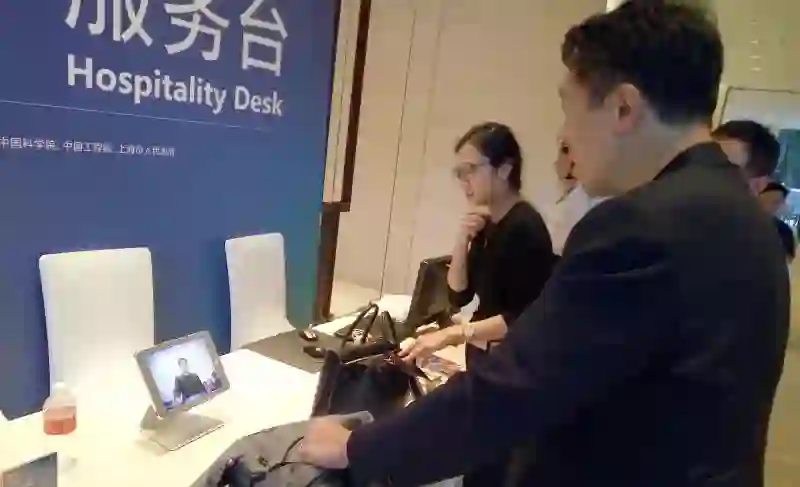 从机场来到酒店,在本次大会指定酒店的前台,也早已配备了商汤科技的人脸识别签到设备,嘉宾只需面对镜头,“露脸”就可办理入住,非常快速和便捷。前来参加本次WAIC 2018大会的国内外大咖们,就是使用了这款商汤科技的智能前台产品进行入住办理。