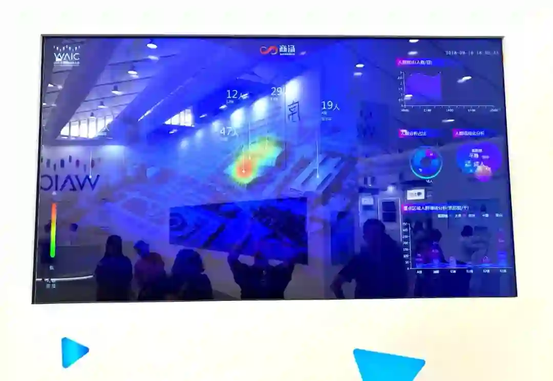 由商汤研发的会场热力图,也有超强的黑科技感,可以看到不同时间不同场馆的人群密度,情绪分析和结构化属性。