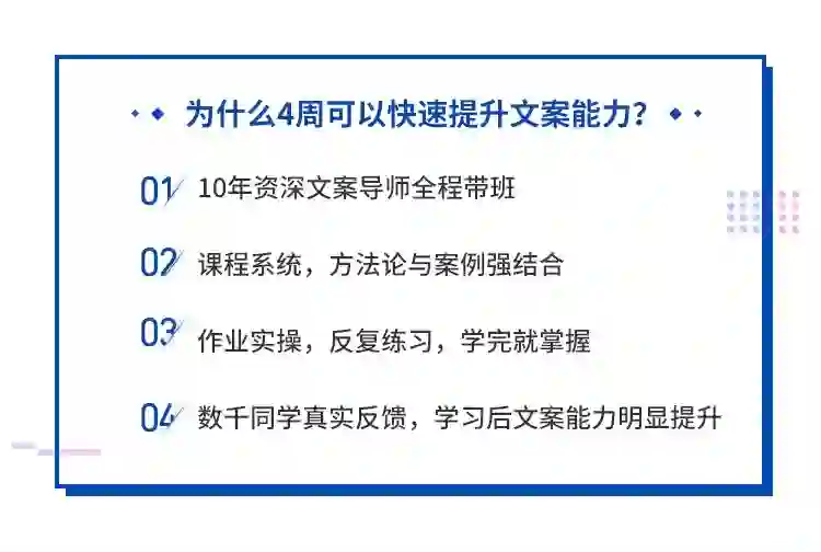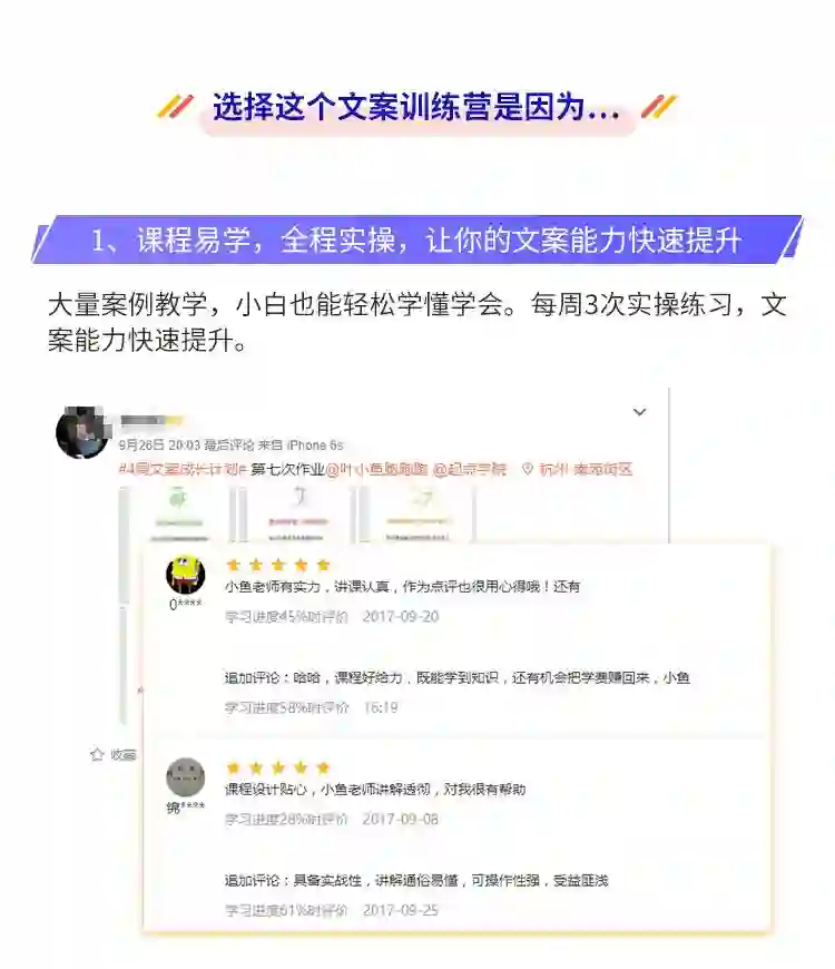 “起点学院&腾讯课堂”联合打造文案训练营,通过4周的系统学习, 11次文案实操,老师的1对1批改和班级群内答疑。