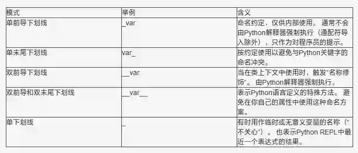 以下是一个简短的小结,即“速查表”,罗列了我在本文中谈到的五种Python下划线模式的含义: